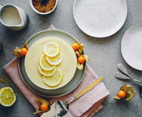 Pour the mixture on top of the bottom layer. Place in the freezer for at least 4-6 hours. Take it out 15-20 min before serving. Decorate with lemon slices and/or inca berries.